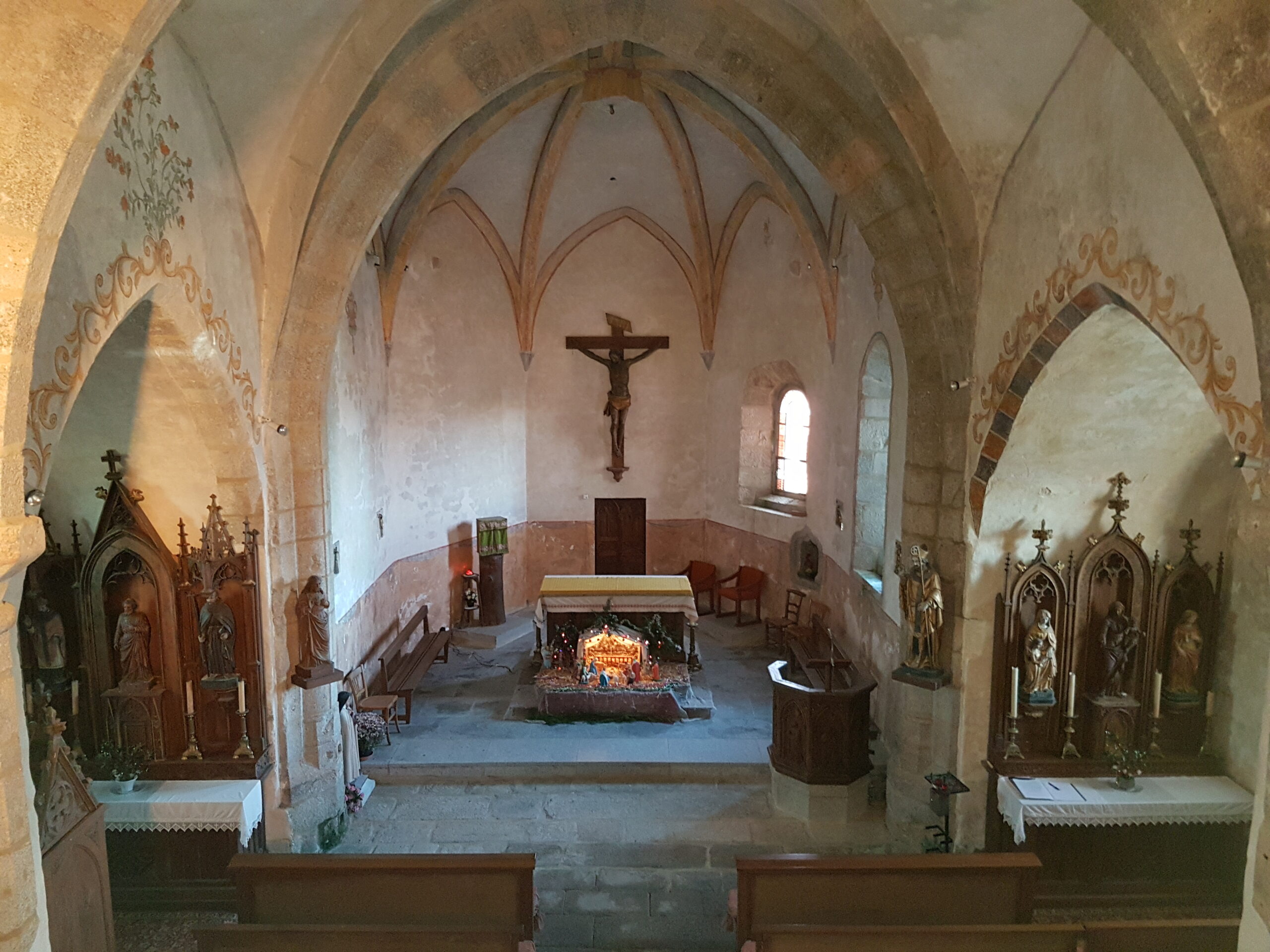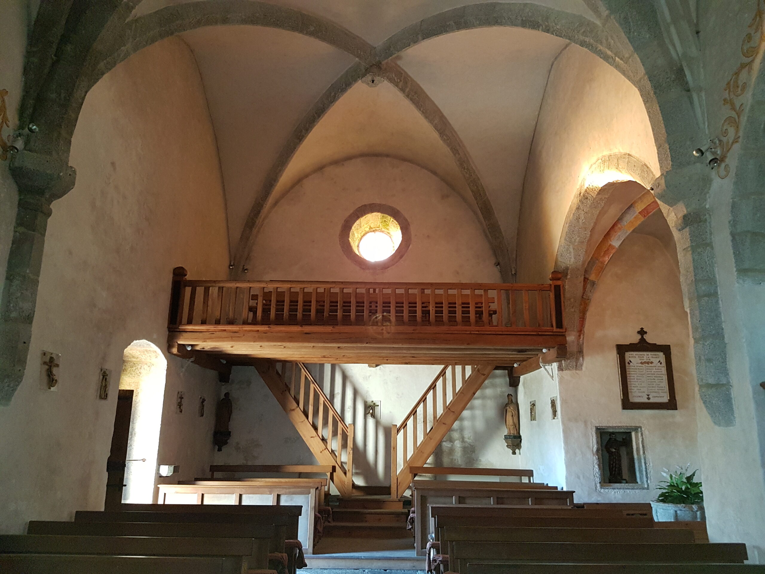 L’église Saint-Jean-Baptiste : située au cœur du village, cette église combine une architecture du XIIIe siècle avec des modifications du XIXe. Son clocher du XVIe siècle, ses douze statues en bois, son Christ monumental peint et sa cuve baptismale en granit en font un monument remarquable. À l’intérieur, les murs et voûtes sont décorés de peintures polychromes aux couleurs chaudes, apportant une ambiance unique.