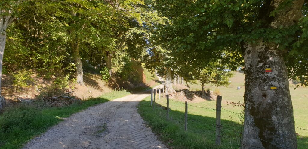 Le chemin ondule entre pins, prairies ouvertes et croix de granit — omniprésentes, comme pour veiller sur les voyageurs.
