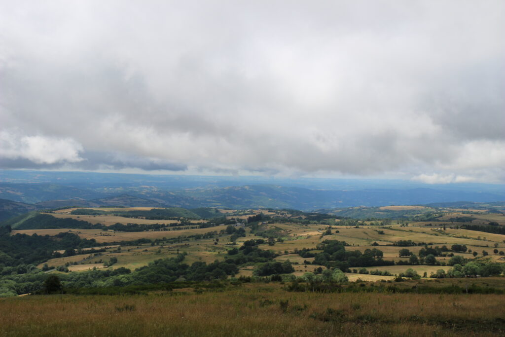 Je monte vers le Signal de Mailhebiau : les panoramas sont majestueux, mais la lumière diffuse crée un effet presque mystique sur les vallées et les bois au loin. La descente vers la forêt d’Aubrac apporte fraîcheur et ombre, puis la vallée de la Boralde se dévoile avec ses nuances plus profondes avant l’arrivée à Saint-Chély-d’Aubrac.