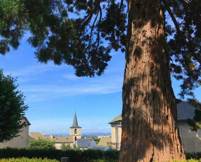 – Le jardin public d’Aumont-Aubrac, à l’ombre d’un séquoia géant.